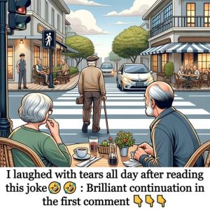 An elderly couple was sitting at a cafe when they noticed an old man struggling to cross the street. The man said to his wife, “He surely…