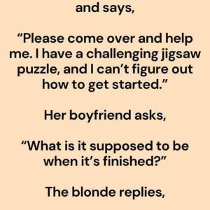 A blonde calls her boyfriend and says, “Please come over and help me. I have a challenging jigsaw puzzle, and I can’t figure out how to get…