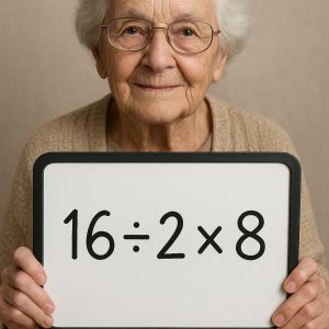 A short explanation in English: Division and multiplication have the same priority, so you solve them from left to right. If someone reads it as 16 ÷…