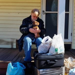 I’ll never forget the sight: my 86-year-old granddad sitting on the porch with a battered suitcase, two trash bags, and a trembling puppy cradled against his chest….